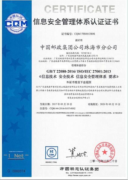 方圓廣東公司頒發(fā)首張郵政系統(tǒng)信息安全管理體系認(rèn)證證書(shū)