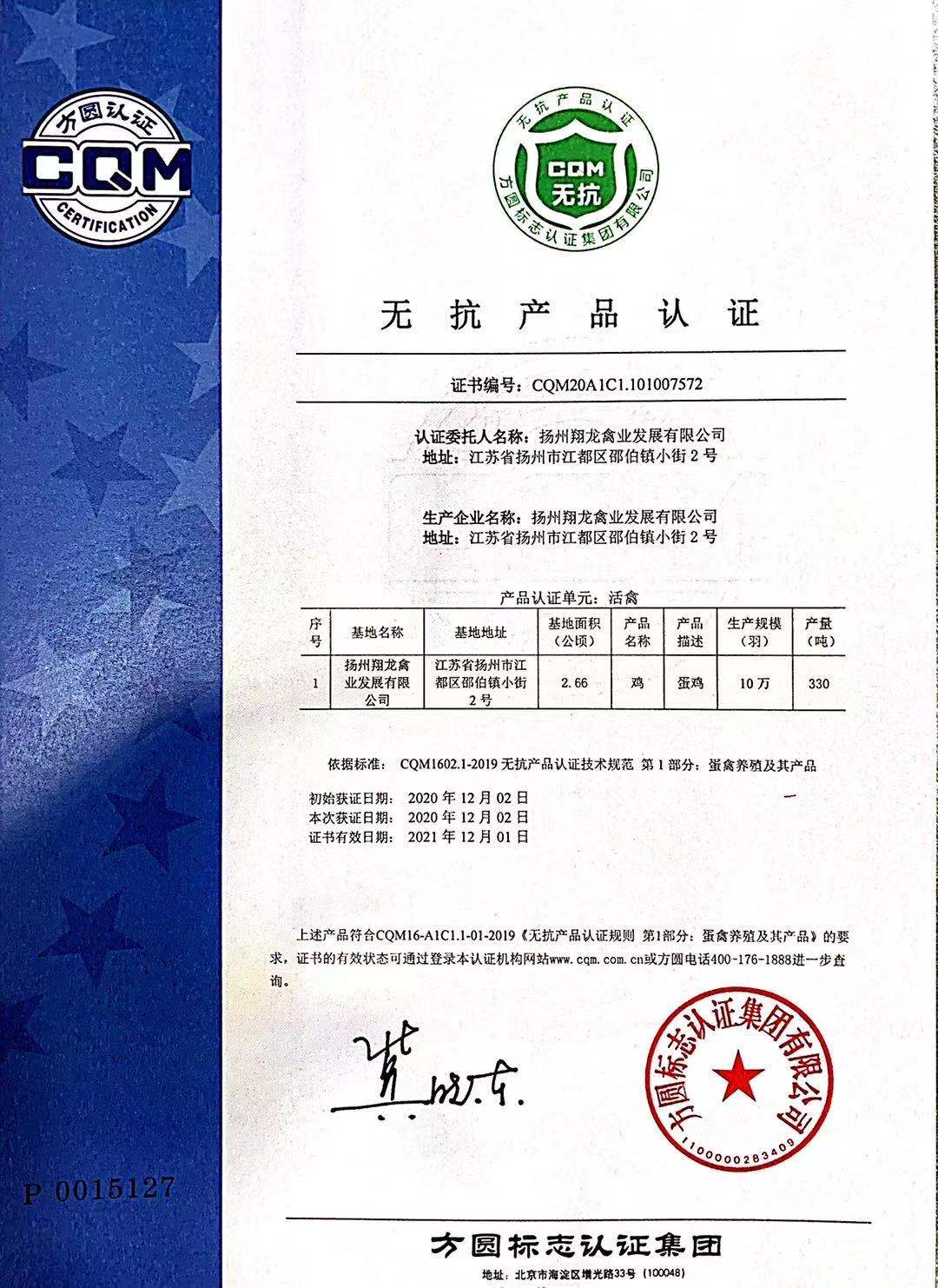 時(shí)間:2020年12月08日 2020年12月02日,方圓浙江公司為揚(yáng)州翔龍禽業(yè)發(fā)展有限公司頒發(fā)了蛋雞和鮮雞蛋兩個(gè)產(chǎn)品的無抗產(chǎn)品認(rèn)證證書,這是浙江公司頒出的首張無抗產(chǎn)品認(rèn)證證書。